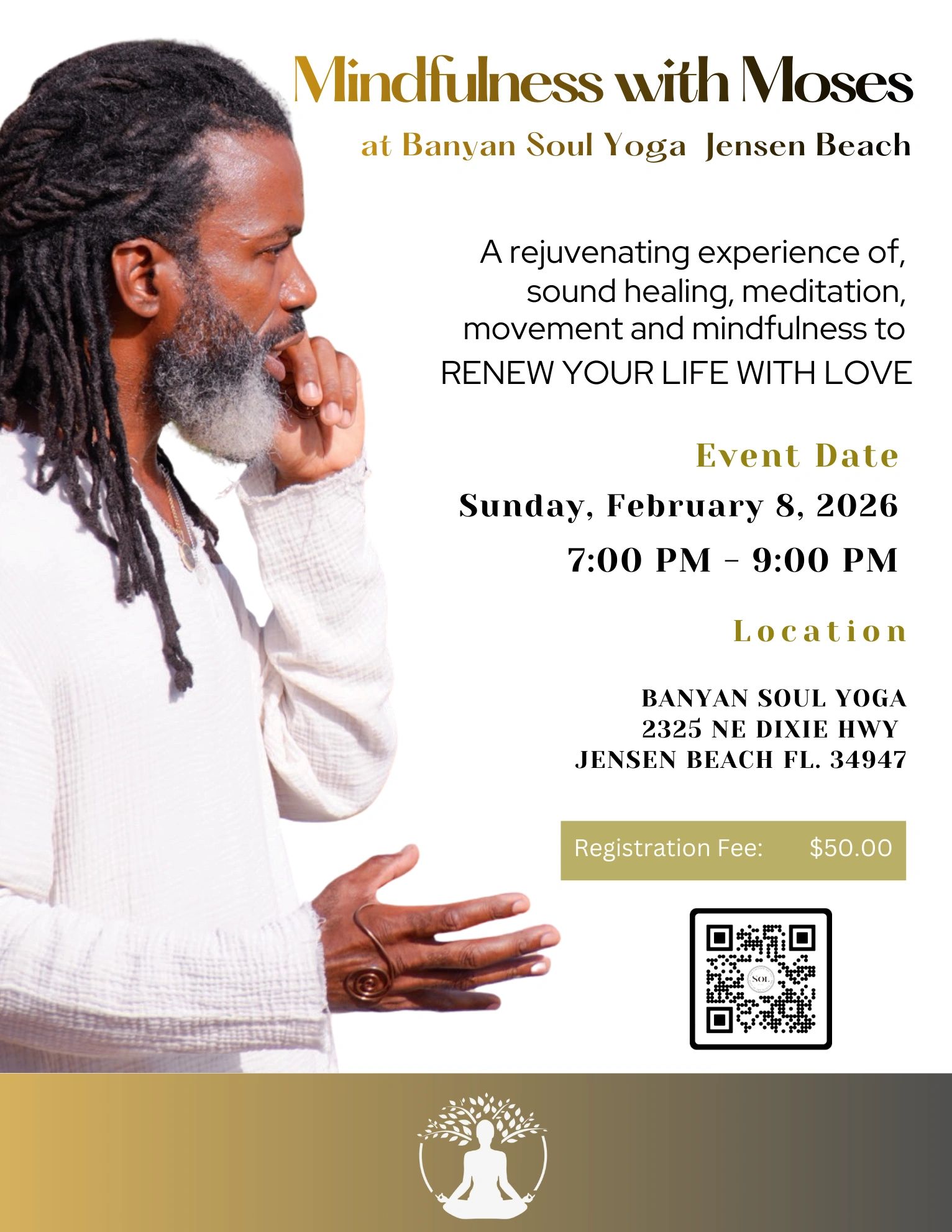 We invite you to join us on Sunday, February 8, 2026 - 7:00 - 9:00 PM for Mindfulness With Moses. This event will be hosted in the Banyan Soul Yoga Studio in Jensen Beach, Fl. During this event, Moses will lead attendees in meditation, mindful conversations, sound healing, yoga movement, and more!